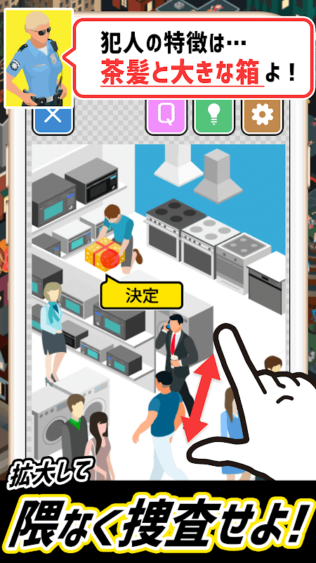 2.イラストを拡大したり上下左右にずらしたりして、特徴に当てはまる容疑者を見つけ出してください