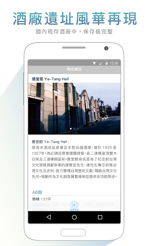 台中文化創意產業園區原為台中舊酒廠廠區並且登錄為歷史建築。園區開放各式有趣並具有教育意義展覽以及互動研習活動,趕快來台中文創園區展開一趟具有濃濃文化氣息,又有科幻創意的文化之旅吧。本APP提供園區即時展覽&研習活動資訊,讓你隨時掌握園區最夯的活動訊息。也可勾選關注的活動類別,APP即可主動推撥相關的新活動,完全不怕漏掉任何新訊息呦。