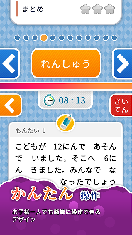 İlkokul birinci sınıf öğrencileri için öğrenme rehberlik yönergelerine referansla yapılan bir matematik çalışma destek uygulamasıdır. Tüm sorular soruları yazılı olarak verilir, böylece sadece hesaplama yeteneğinizi değil, aynı zamanda "okuma yeteneğinizi" ve "düşünme yeteneğinizi" de geliştirebilirsiniz.