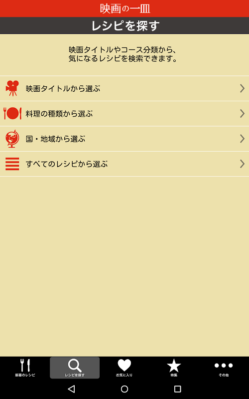 映画のタイトルや、たくさんの料理の種類の中から、180を超えるレシピを検索できます。