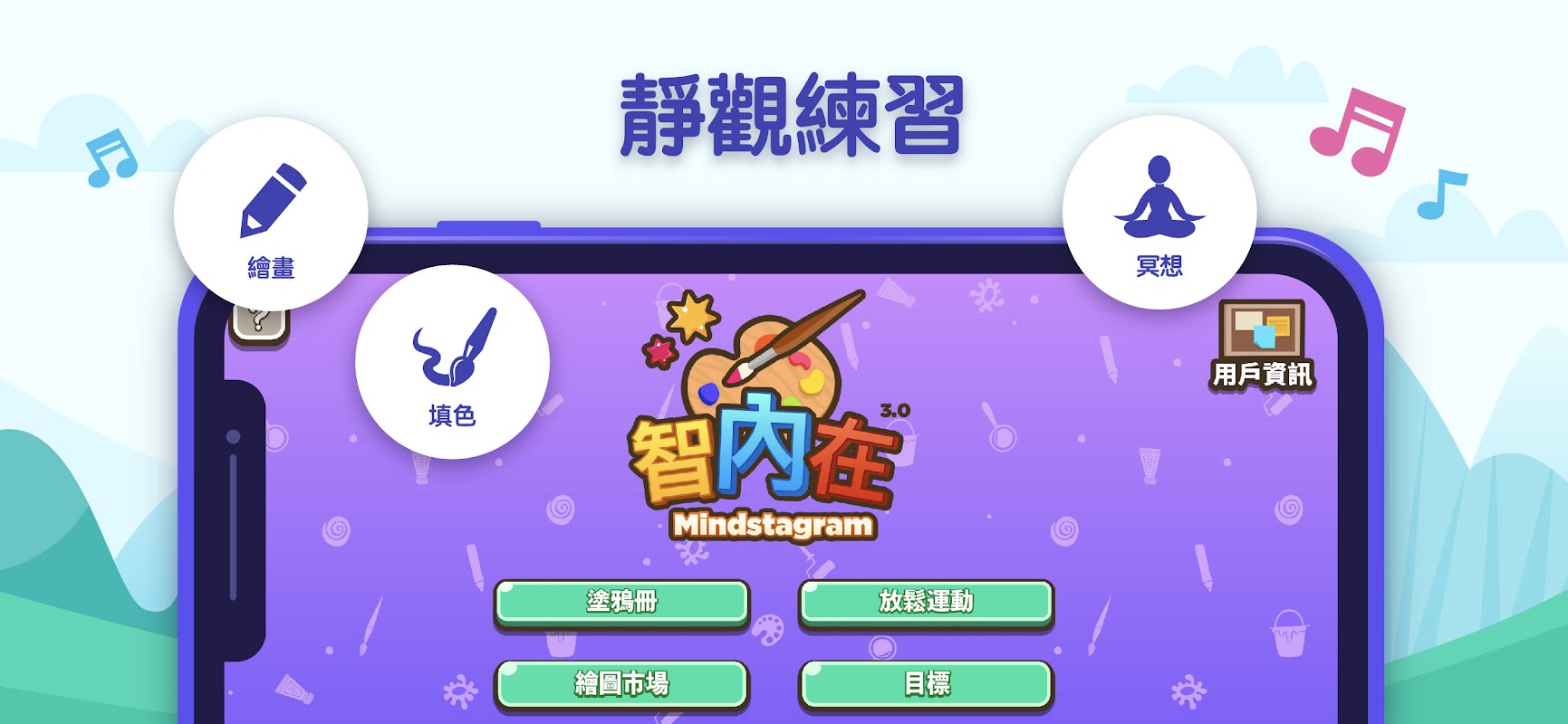 Oyun programının birinci ve ikinci aşamaları, kullanıcılara programın yerleşik çizim / renklendirme / müzik ve görüntü işlevleriyle, bireysel ihtiyaçlarına göre farklı dikkatli çizim / dikkatli boyama ve meditasyon alıştırmaları için uygun bir ortam oluşturmalarına yardımcı olur. Kullanıcıları daha fazla resim paylaşmaya ve indirmeye teşvik etmek ve kolaylaştırmak ve sessiz çalışma alışkanlığını geliştirmeye devam etmek için, program (1) "Çizim Pazarı" ve (2) "Hedef Belirleme" yi içerir. Deneme ve sürekli farkındalık uygulaması yoluyla, kullanıcılar kendileriyle ilgili farkındalıklarını öğrenebilir ve artırabilirler.Farklı duygular, düşünceler ve fiziksel koşullarla iyi geçinmeyi öğrenmek, duygularını etkili bir şekilde düzenlemeye ve güçlüklerle "akıllıca başa çıkma" etkisine ulaşmaya yardımcı olacaktır.