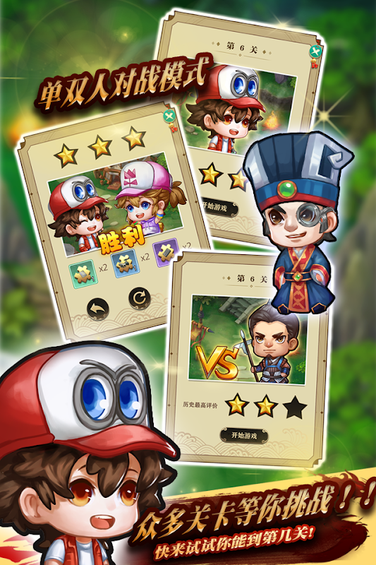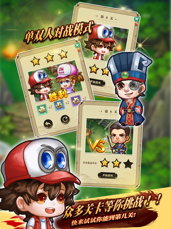 通过选择符合一定规律的卡牌来克服困难达成目标,开动脑筋完成关卡!可是也会有其他人来阻拦,努力战胜他们!