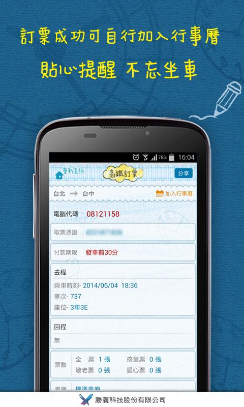 10. 加入行事曆:訂票車次加入行事曆,提醒坐車好貼心。