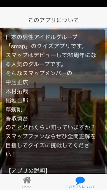 日本の男性アイドルグループSMAPのクイズアプリです。
