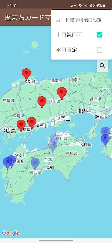 Rekimachi Kartları edinebileceğiniz konumlar haritada işaretleyicilerle görüntülenir.