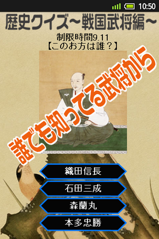 歴史クイズ-戦国武将編は戦国時代に活躍した武将の肖像画を見て正解を選ぶ4択クイズで、誰でも知っている武将からあまり知られていない武将まで幅広いクイズが出題されます。