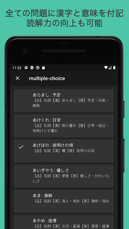 ここでは表示された問題に最も適切な答えを3つの選択肢の中から選択します。答えが分からない場合は適当な選択肢をタップするのではなく「分からない」を選ぶようにしてください。約10問が1つのレッスンになっているため、レッスンの問題全てに回答した後、正解を確認することが可能です。
