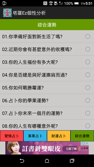 【每日塔羅~運勢及個性分析】是一款便利實用的個性解析應用軟體,透過塔羅牌生命靈數數字了解個人擁有本性、內在、外在天賦數字的正負面個性分析,40歲前後運勢數字,並說明個人主要性格、愛情緣分、人際關係等個性分析,畫面簡單易看,可儲存分析結果做為日後查詢使用。