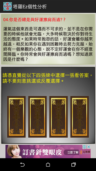 【每日塔羅~運勢個性分析】是一款便利實用的個性解析應用軟體,透過數字了解個人擁有本性、內在、外在數字正負面,40歲前後運勢數字、主要性格、愛情緣分、人際關係等。