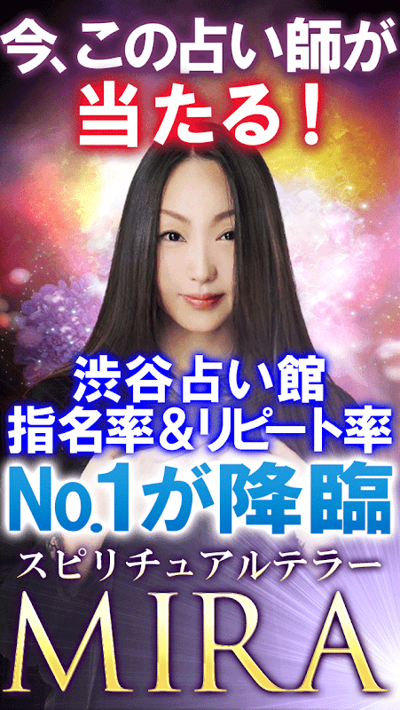 『今この占い師が当たる』渋谷占いの館、リピート率&指名率No.1占い師『MIRA』。鑑定歴18年、鑑定人数2万人。ロンドンで7年の鑑定実績をもつ、ファン続出、リピートが絶えない最も人気の占い師の鑑定がアプリでお楽しみいただけます。彼女の声を求めて人気アイドルグループの46人やモデル、女優が虜になる人気の占いをお楽しみいただけます。