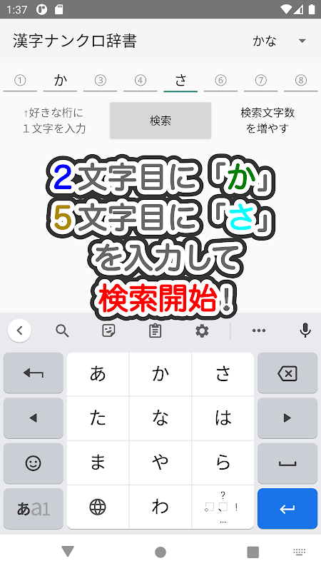 Bu, Kanji Nankuro / Kanji Crossword bulmacalarına cevap vermek ve soru oluşturmak için kullanılabilecek bir sözlük uygulamasıdır. "Kana" karakterleri de çapraz bulmacalarda kullanılmak üzere desteklenir.