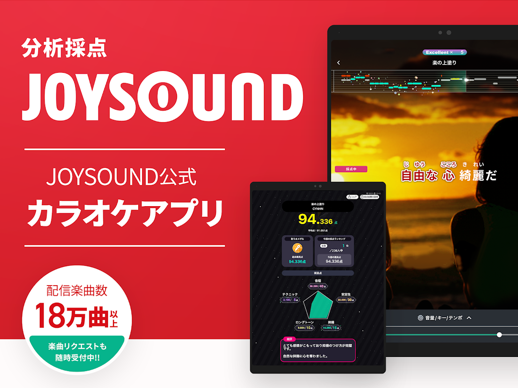 JOYSOUND'un 180.000'den fazla şarkıya sahip resmi karaoke puanlama uygulaması! Evdeki bardan tanıdık "analiz puanlama" ve "puanlama sıralaması"nın tadını çıkarın! Perde çubukları ve kayıt gibi çeşitli özelliklerle şarkı söylemenizi geliştirin!