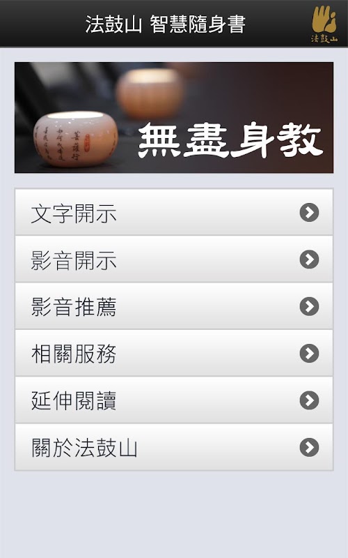 「無盡身教」APP收錄了聖嚴法師《無盡的身教──聖嚴法師最後的一堂課》、五集《今生與師父有約》、《聖嚴法師學思歷程》、《老鼓手》等12種文字及影音分享,內含法師在日常生活中,對弟子言談與行儀的細膩調教,以及於國內外弘化時,應機教化大眾、調柔眾生的方便;乃至法師晚年臨病,面對生死的自在身教……,再次聆聽聖嚴法師的親切教示,領略法師的悲智願行。