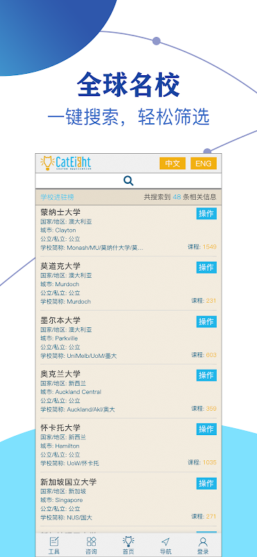 2. 新增“课程搜索”,你可以搜索澳大利亚、新西兰、新加坡的各级各类学校课程,查看课程详情;