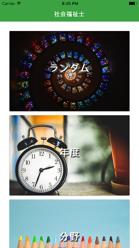 メニューは、ランダム、年度、分野、お気に入り、履歴を用意しています。