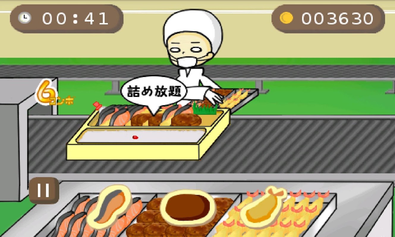 流れてくる弁当箱にひたすら具材を詰めていくゲームです