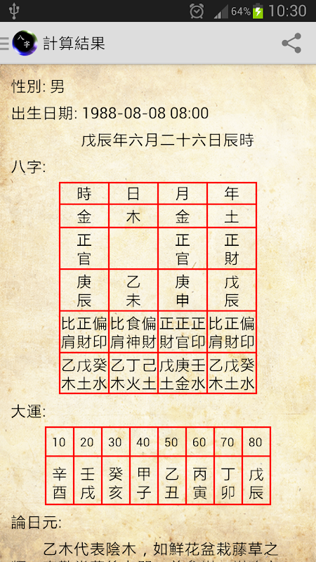 2. Hesaplamaya basın, program doğum tarihinizi ay takviminde, sekiz karakterli doğum haritasında, seksen yıllık Büyük Kanal'da ve referans için kişilik özelliklerinizin basit bir tanımını gösterecektir.