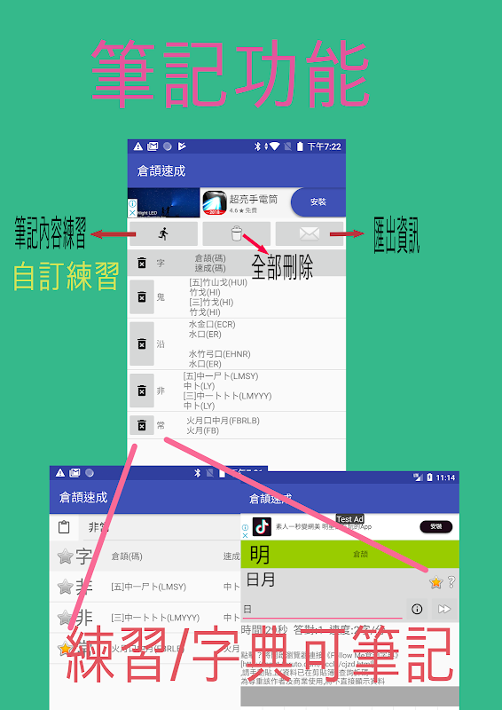 多樣話練習模式 ,有600,3000多個字庫,可以自定義練習並匯入,讓你沒有字庫限制