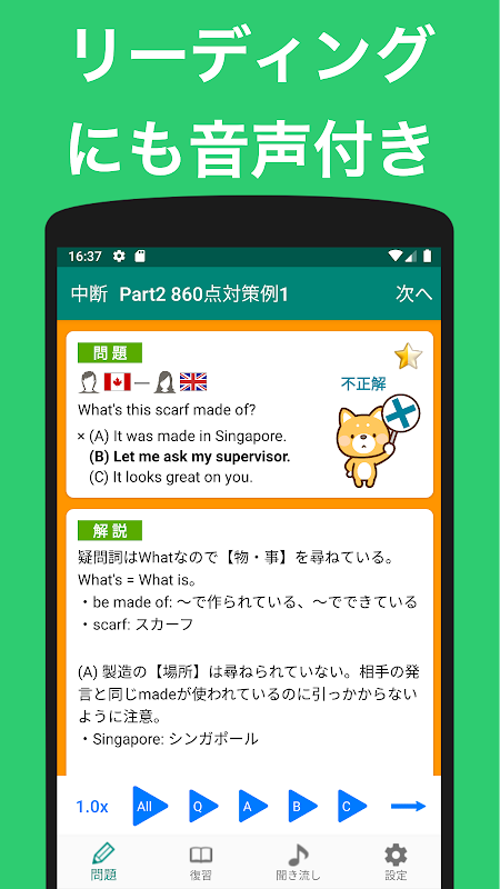 TOEIC® L&R sınav hazırlık uygulamalarında yaygın olan, dostane olmayan açıklamalar veya doğal olmayan Japoncadan rahatsız olmadan, her soruyu iyice anlayarak çalışmalarınıza devam edebilirsiniz.