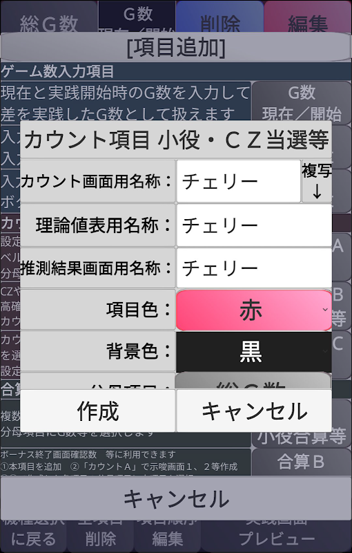 設定推測計算に影響する各種フラグ等を入力します。「G数」や「カウントB」を分母として、現在の出現率表記できます。