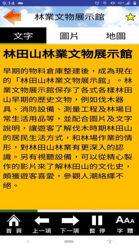 林田山林業文化園區保存台灣最完整的伐木基地。園區各種伐木器具、傳統消防物等豐富的文物,以及等級扁柏蓋成的中山堂、日式檜木建築群,濃厚林業歷史的林田山,成為旅客來花東縱谷必拜訪的人文景點。 本軟體收集並整理花東縱谷風景區與林務局的開放資料,目標在發展容易上手免費下載體驗林田山的實用行動導覽,讓使用者輕鬆悠活探索台灣最吸引人的林業園區。