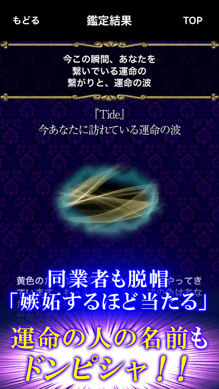 ※有料にて購入された鑑定メニューは、メニュー一覧下の「購入履歴」から閲覧することができます。「異なる端末でアプリをインストールした場合」や、「一度アプリをアンインストールしてから再度インストールし直した場合」には履歴情報が引き継がれませんので、画面キャプチャ等で保存することをおすすめいたします。