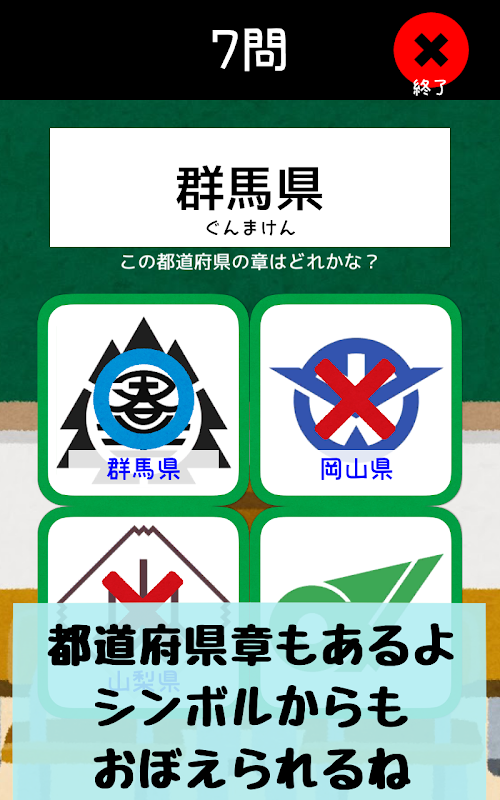 日本地図での都道府県の位置や形、都道府県章など雑学としても勉強になるよ。