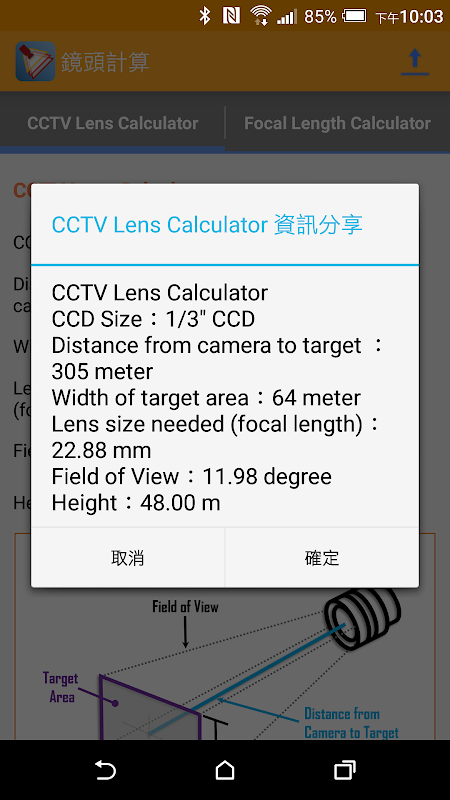 "Lens Hesaplama", hem lens hesaplamasını hem de odak hesaplamasını gerçekleştirebilen bir APP uygulamasıdır. Lens hesaplaması lens boyutu seçimi, mesafe ve hedef uzunluk ayarı ile hesaplanabilir ve odak uzaklığı değeri, görüş alanı (FOV) ve hedef alanın dikey yüksekliği hesaplanabilir. Odak uzaklığı hesaplaması yatay odak uzaklığı hesaplamasını ve dikey odak uzaklığı hesaplamasını içerir Odak uzaklığı değeri, mercek boyutunun seçimi, mesafe ve hedef uzunluk ve genişlik ayarları ile hesaplanabilir. Lens boyutu yedi tip arasından seçilebilir: 1/4, 1/3, 1 / 2.5, 1/2, 1 / 1.8, 2/3 ve 1 inç. Dört tür ölçü birimi vardır: metre (metre), ayaklar (inç), inç (inç) ve mm (mm).