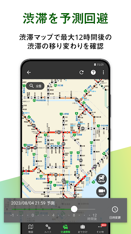 ・ETC専用化に伴い増加しているインターチェンジの通行止め・規制情報を、「交通情報」タブの地図上に表示するようになりました。対象のアイコンをタップすると、規制内容などの詳細もご確認いただけます。