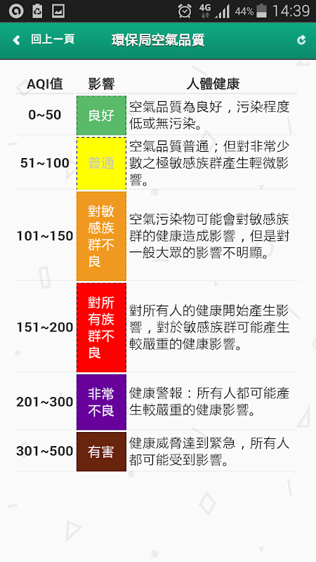原空氣污染指標(PSI)自105年12月1日起行政院環境保署改以空氣品質指標(AQI)表示,故進行內容修正。