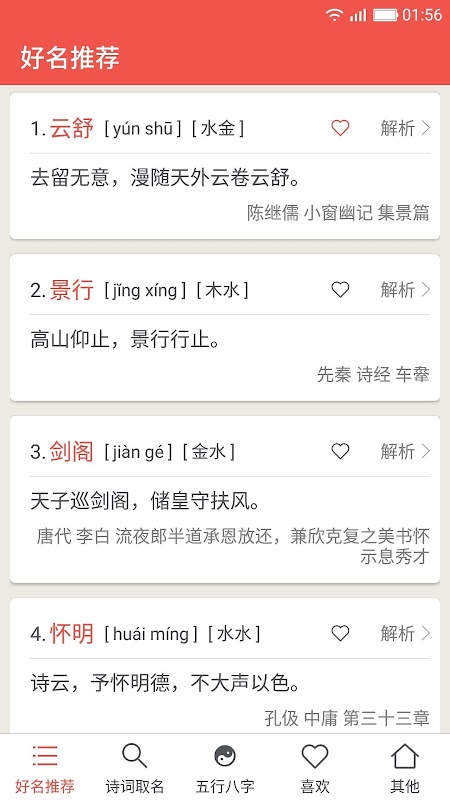 1.在唐诗宋词元曲、四书五经、诗经楚辞、易经、二十四史、传记游记中起名取名,有出处、意境好、音韵美。当之无愧的起名大师、取名神器、起名大全、取名宝典。