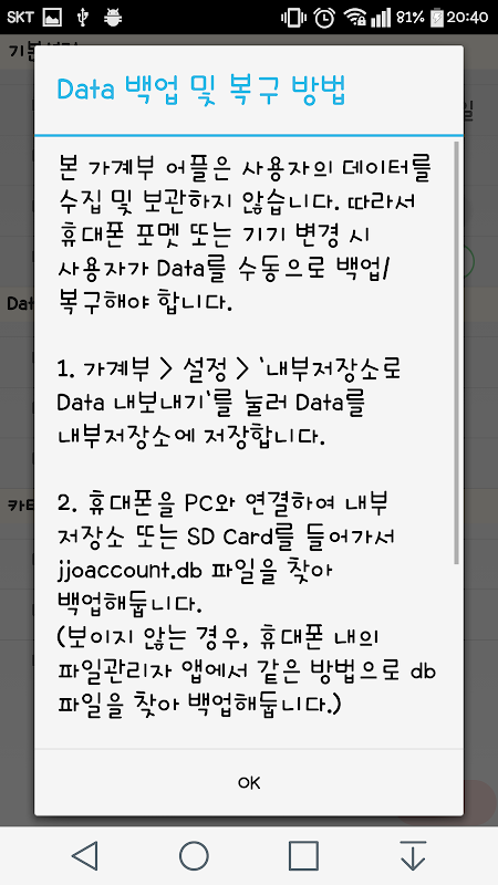 본 가계부 어플은 사용자의 데이터를 보관/수집하지 않습니다. 따라서 직접 데이터를 백업/복구해주셔야 합니다. 자세한 방법은 설정 메뉴에 설명되어 있습니다.