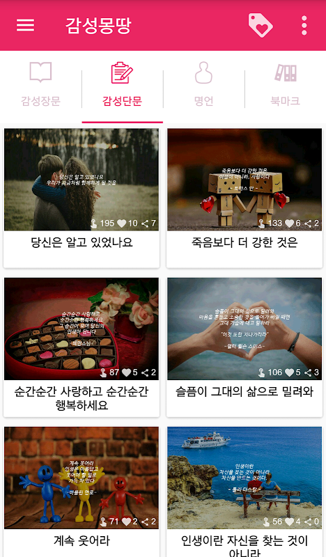 - 감성글귀(장문, 단문 포함), 명언 제공