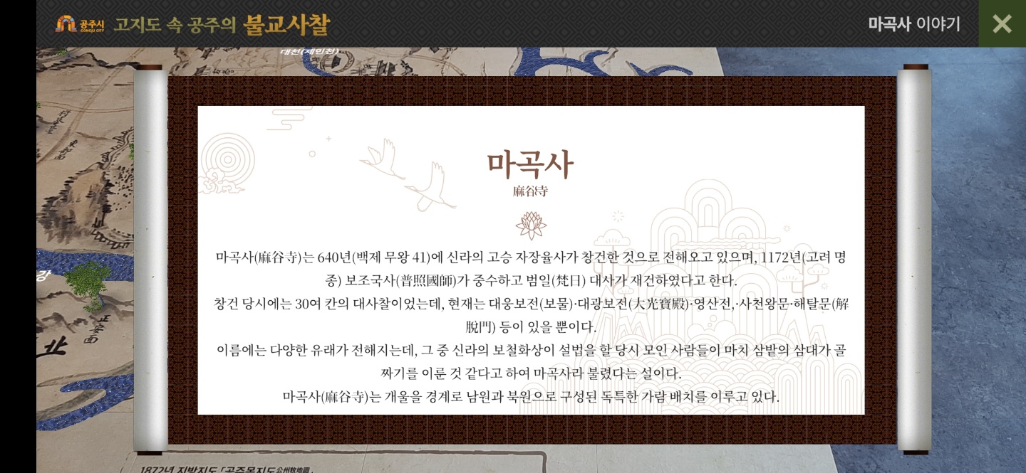 Eski bir haritada (yerel harita, Gongju Mokjido, 1872) Gongju'daki Budist tapınaklarına seyahat etmenizi sağlayan bir artırılmış gerçeklik (AR) uygulamasıdır.