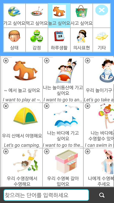 일상에서 자주 사용하는 단어를 카테고리별로 나누어 몇번의 아이콘 터치만으로 자연스럽게 회화를 익힐 수 있습니다.