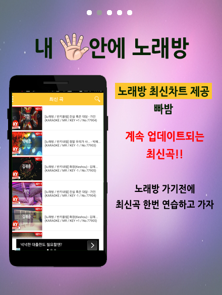 - 내 손안에 노래방에서 최신 노래들을 섭렵하면 유행에 뒤처지지 않는 최신곡 습득!