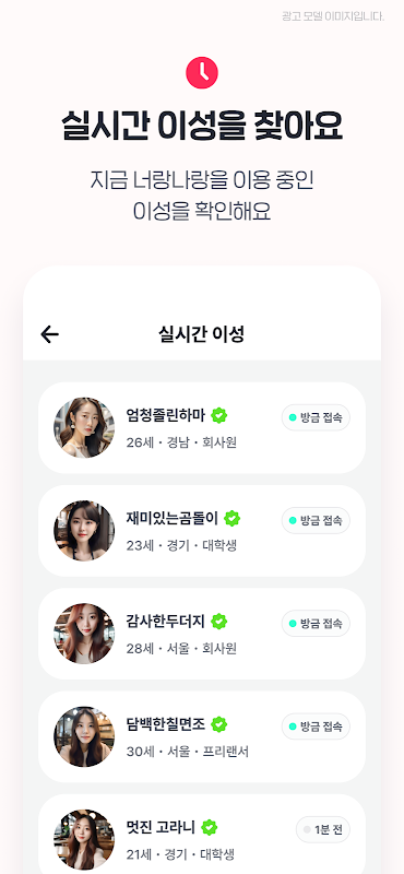 ㆍ Gerçek zamanlı olarak bağlanan karşı cinsi kontrol edin ve sohbet edin!