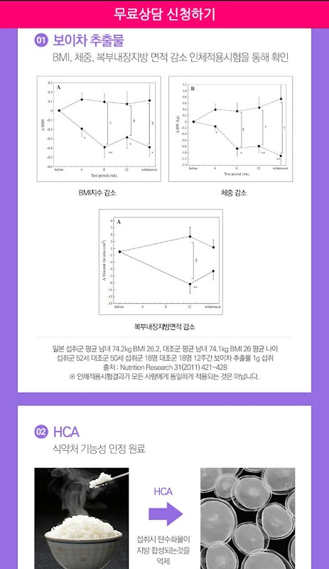 아침에 섭취시 체지방을 감소시켜주고 식사시 탄수화물이 지방으로 합성되지 않도록 도와주며, 저녁에 섭취시 기초대사량 상승과 배변활동 및 붓기를 개선해 주는 제품입니다.
