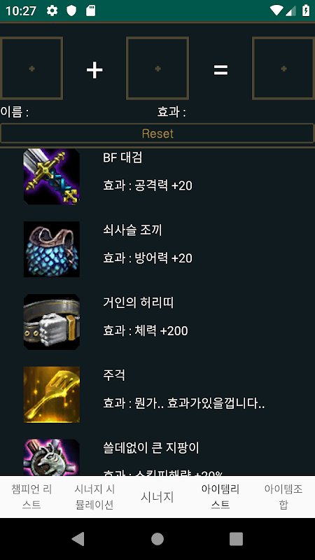 Şampiyon listesi, sinerji simülasyonu, madde listesi, madde simülasyonu, madde kombinasyon listesi