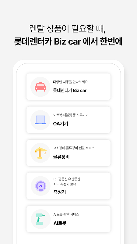 Danışmanlık taleplerinden sözleşme yönetimine kadar, araçlar, OA cihazları, lojistik ekipmanları, ölçüm cihazları ve yapay zeka robotlarıyla ilgilenen Lotte Rent-a-Car Bizcar ile karmaşık görevleri basitleştirin!