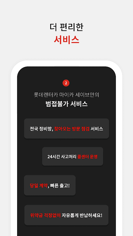 Araç bakımı konusunda pek bilginiz olmasa veya vaktiniz olmasa bile Lotte Rent-a-Car My Car Save kullanıyorsanız endişelenmeyin! Profesyonel personel sizi bizzat ziyaret edecek ve güler yüzlü bakım sağlayacaktır.