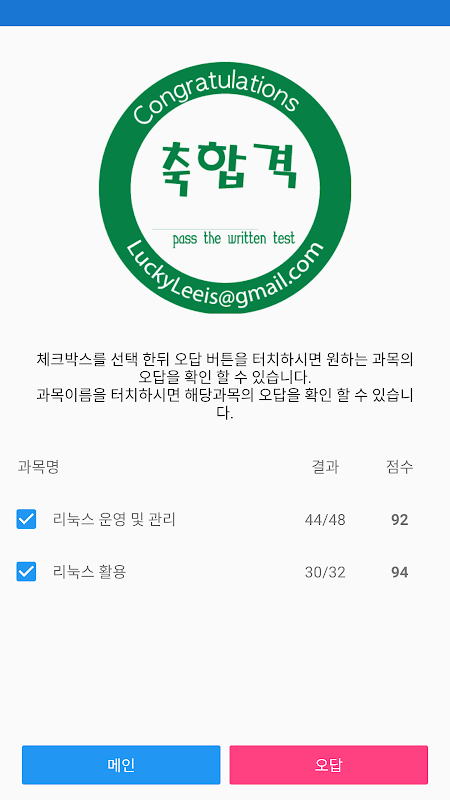 성적확인 - 각 과목별 성적 및 그동안 풀어본 기출문제와 모의고사, 문제풀기의 성적을 볼 수 있습니다.