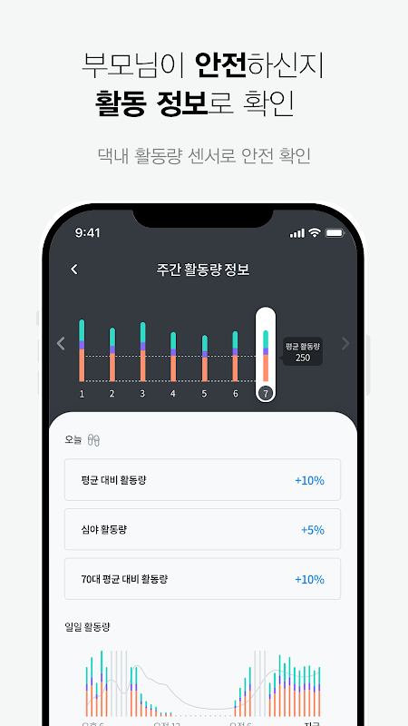 매일매일 자녀안심 서비스 : 매일 부모님의 안부를 확인할 수 없는 자녀에게 하루 전의 부모님 안전과 건강상태를 매일 오전 10시에 문자로 보내드립니다. (앱으로도 확인 가능)