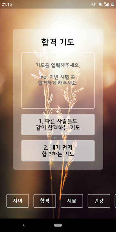 자녀 기도, 합격 기도, 재물 기도, 건강 기도, 승진 기도, 사업 기도, 배우자 기도, 부동산 기도가 준비되어 있습니다.