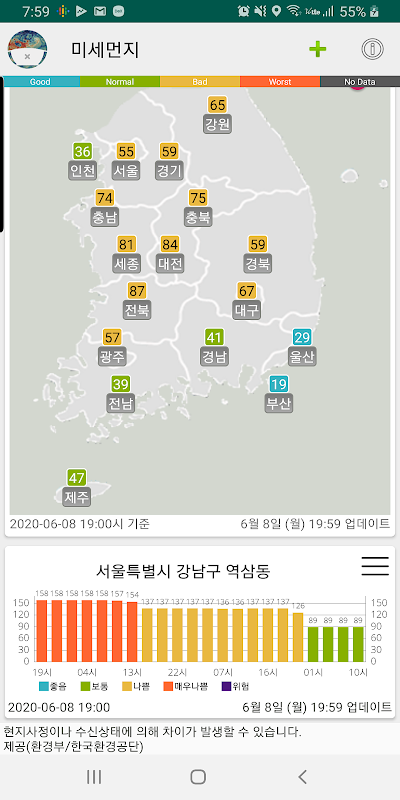 + 환경부 한국환경공단(에어코리아)에서 실시간으로 제공하는 대기오염정보(미세먼지, 초미세먼지, 오존, 이산화질소, 일산화탄소, 아황산가스)를 표시합니다.