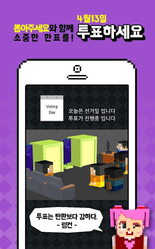 “뽑아주세요”는 내가 직접 후보자가 되어 유권자를 내 지지자로 설득하여 선거를 치르는 선거게임 입니다.