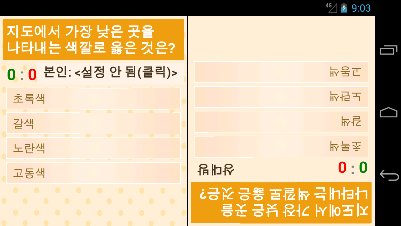 다. 사회 마주보기: 2인용으로서 스마트폰을 가운데 두고 친구와 마주앉아 퀴즈를 풀며 자신의 승율 쌓기