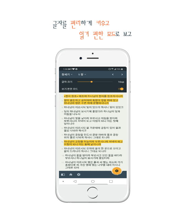 성경을 읽기 편하게 글자크기 조절과 블루라이팅을 이용한 보기편한모드를 제공합니다.