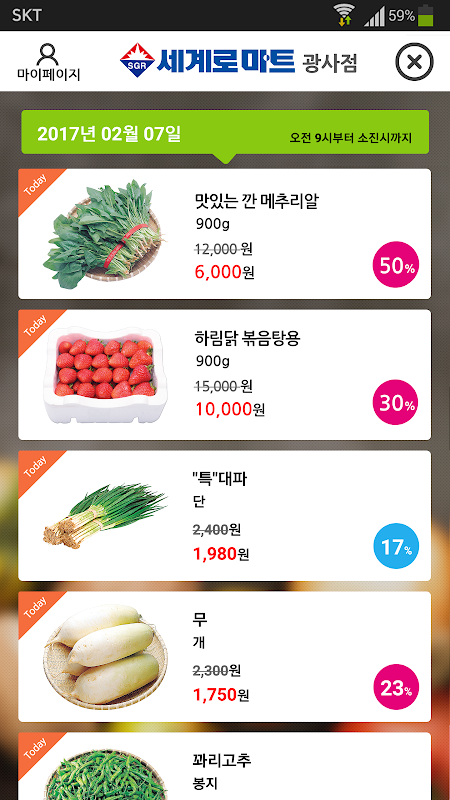 매일매일 할인에 기간별 할인까지 세계로마트 광사점의 세일정보를 확인하세요.