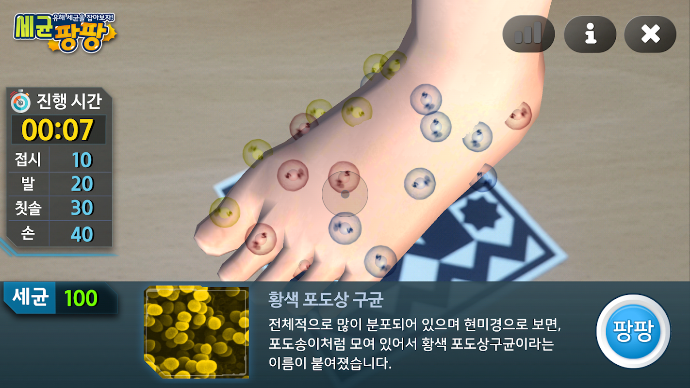 각 종 사물과 신체에 붙어있는 세균을 터뜨리며 기록을 세워 보세요.